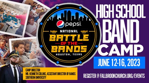 Join us June 12-16, 2023 at Fallbrook Church for an unforgettable High School Band Camp directed by Mr. Kenneth Collins, Assistant Director of Bands at Southern University. Campers will have full band rehearsals twice per day and attend sectionals. They will also experience a masterclass in musicianship, ensemble practice, practice time, and world music. Camp schedule will be emailed upon registration.